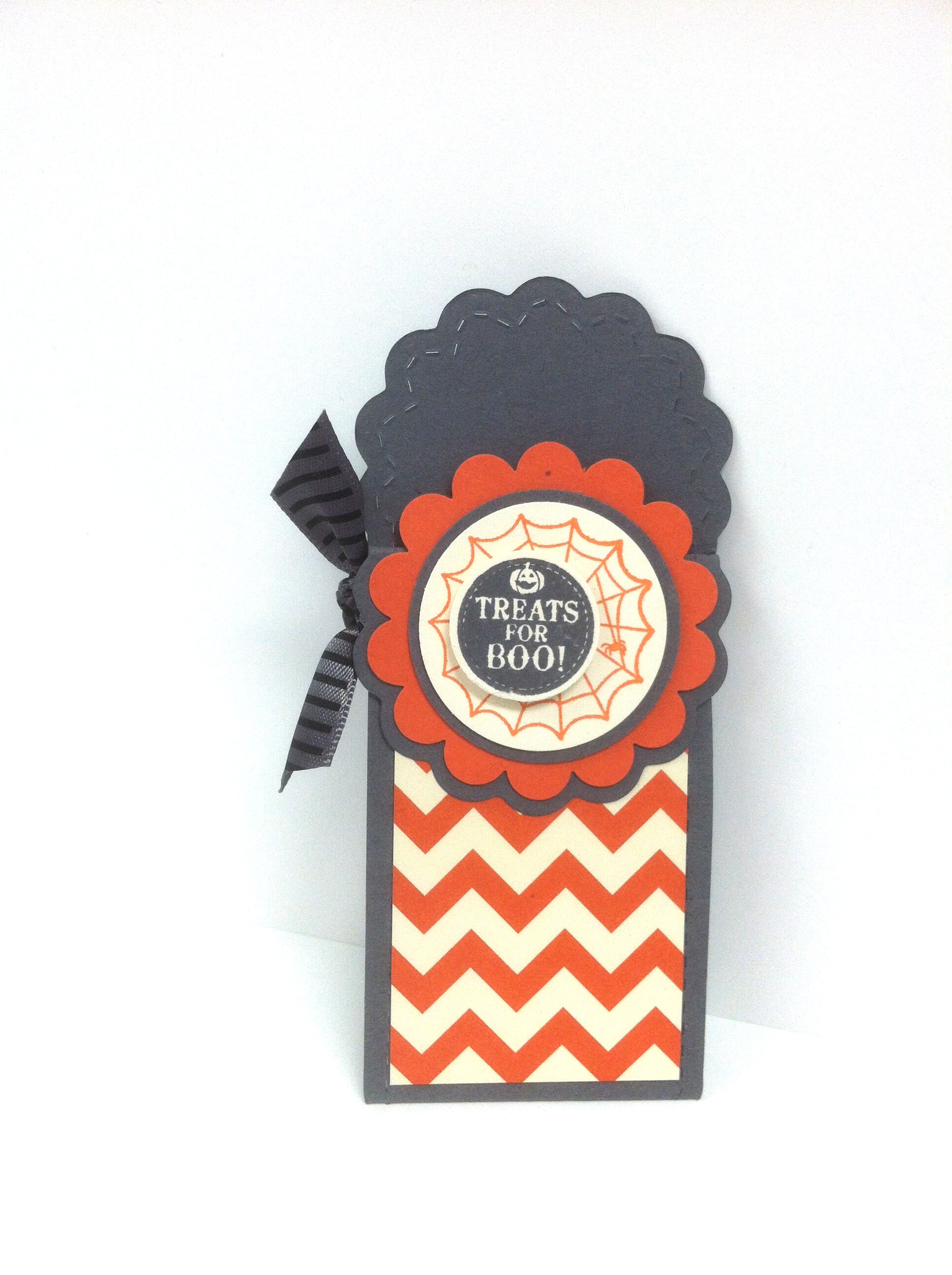 Today I’m showing you a Halloween version of the treat holder I showed you a few weeks ago as a part of the 12 Days of Christmas. It is made exactly the same way. I just changed up the colors and dsp to make it Halloween themed.
